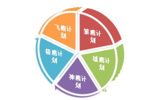 雏鹰计划:针对1-3年左右的新员工,尽快了解公司情况,熟悉工作岗位,认同公司文化,适应工作环境,完成现有角色,寻找未来职业发展方向。 飞鹰计划:定位是在我公司涉及的某一专业领域掌握较高实践水平的专家型技术人才,具备相应的技术职称和专业执业证书,通过现场实践、总结提高、论坛交流等方式落实个人培养计划。 精鹰计划:定位为公司或部门内具备较全面的知识体系且有较高管理水平的综合性管理人才。 神鹰计划:定位培养具有创造性、创新意识、创新精神、创新能力等素质人才,关注专业前沿发展动态,有较为超前的敏锐感知力,旨在搭建合理的创新人才组织架构,持续强势地维护公司在行业中的话语权。 雄鹰计划:定位领导力培养,主要方向为重要岗位的中高层接班人的战略人才,综合考量管理者层级、在岗年限等多种因素,跟踪管理,定向培养,确保企业的可持续发展。