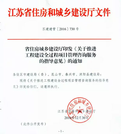 2016年12月30日,为贯彻落实住建部《关于开展建筑业改革发展试点工作的通知》(建市[2014]64号)和《关于推进主业发展和改革的若干意见》(建市[2014]92号)文件部署要求,江苏省住房和城乡建设厅在全国范围内率先发布《关于推进工程建设全过程项目管理咨询服务的指导意见》的通知(苏建建管[2016]730号),进一步加快了整个建筑监理行业改革的进程,为国家一带一路的战略部署提供了可行的区域性政策环境。 2、这个文件引领供给侧改革发展大局 这个文件,响应了中央关于充分发挥市场在资源配置中的决定性作用,更好发挥政府规划引导和政策支持作用的整体要求,对于推进工程咨询服务行业的供给侧结构性改革,促进工程监理与相关咨询行业的业务融合起到了落实推进的积极作用。 3、这个文件可能影响我国建筑业发展改革方向 按常州市城建局副局长贡浩平的总结,未来的行业治理发展应该是充分实行建筑设计施工一体化、工程项目管理全过程一体化和建筑市场行政管理一体化。三个一体化,一定能更加科学奠定建筑行业未来十年科学发展的基础,从而促进行业更加健康发展成长。